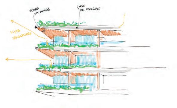 Terraço linear com conceito de casas suspensas, acompanhado de floreiras ricas em biofilia. Projetado com fachada contínua e direcionada para vista da Vila Nova Conceição e do Parque Ibirapuera.