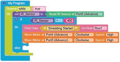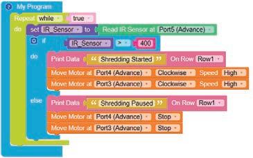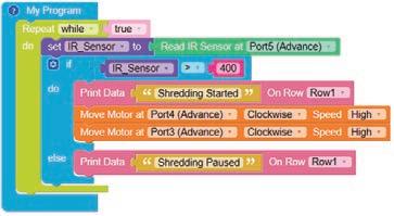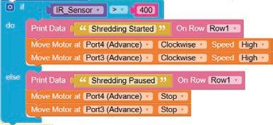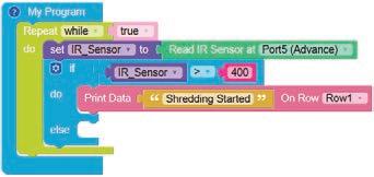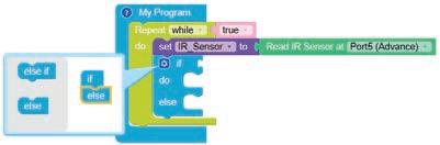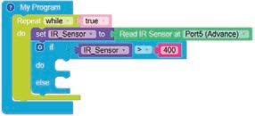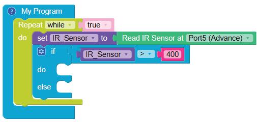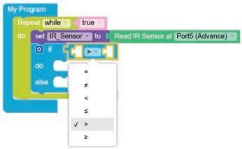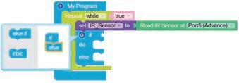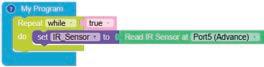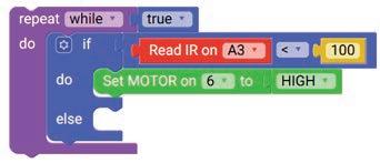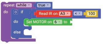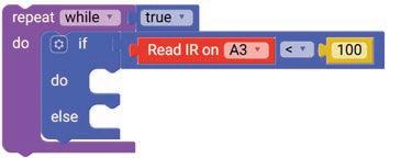 8. Drag the Read IR on block from the SENSORS category and drop it in the left part of the less than operator block. Set the pin number to A3.