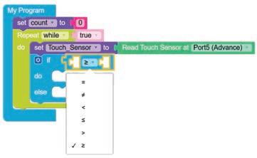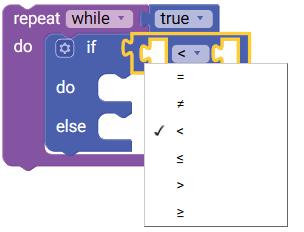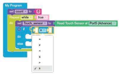 6. Drag the equal operator block from the LOGIC category and attach it to the if block. Select ‘>’ option from the drop-down of the equal operator block.