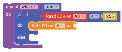 7. Drag the Read LDR on block from the SENSORS category and drop it in the left part of the greater than operator block. This block is set to pin ‘A0’ by default.