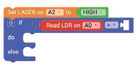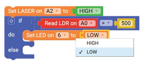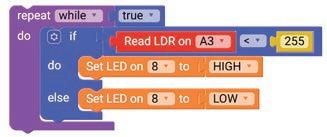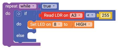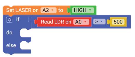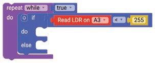 8. Drag the Read LDR on block from the SENSORS category and drop it in the left part of the less than operator block. Set the pin number to A3.