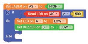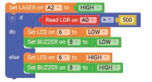 15. The laser keeps the LDR active. When the light path is blocked, the brain module senses the change and turns on the LED and buzzer as an alarm.