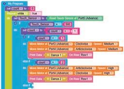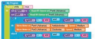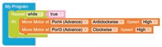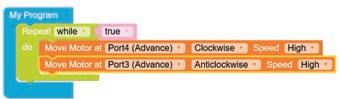 • To move the bot backwards for infinite time, use the Repeat while block from the Loops category with the Move Motor at blocks.