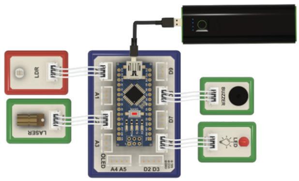 • Connect the Laser module to pin A2 on the brain module using a 3 pin wire.