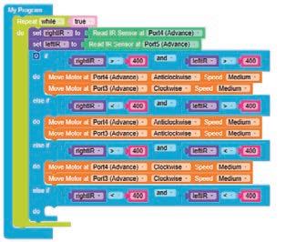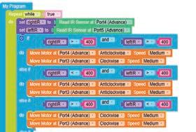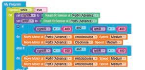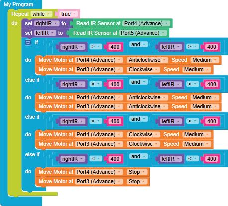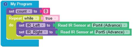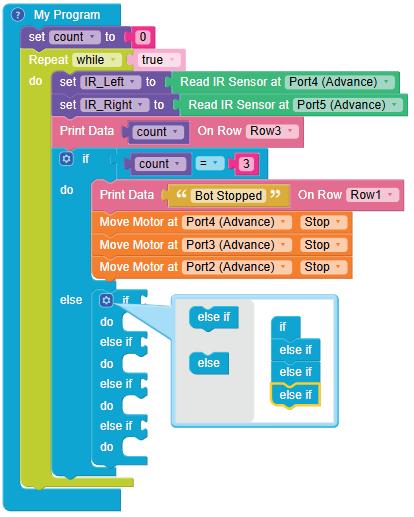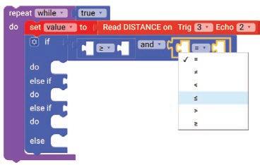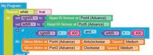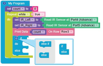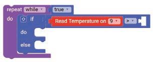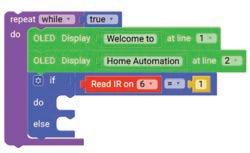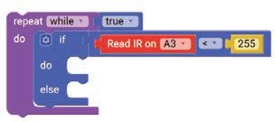 8. Drag the Read IR on block from the SENSORS category and drop it in the left part of the < (less than) operator block. Select A3 from the drop-down of the block.