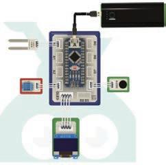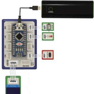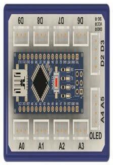 3 The OLED display is connected to pins and of the brain module.