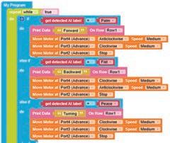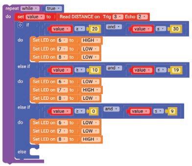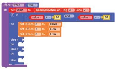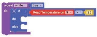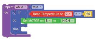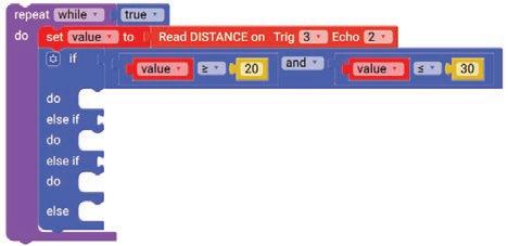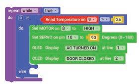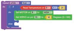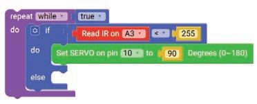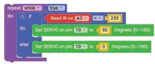 10. Drag the Set SERVO on pin block from the OUTPUT category and drop it in the do part of the if block. Select ‘10’ for the pin from the drop-down and type ‘90’ in the text part of the block for degrees.
