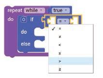 27. Drag another if block inside the second if block. Drag the equal operator block and attach it to the third if block. Select ‘>’ option from the drop-down of the block.