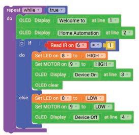 9. Drag the Read IR on block from the SENSORS category and attach it to the Set IR IN to block. Select ‘9’ for pin from the drop-down.