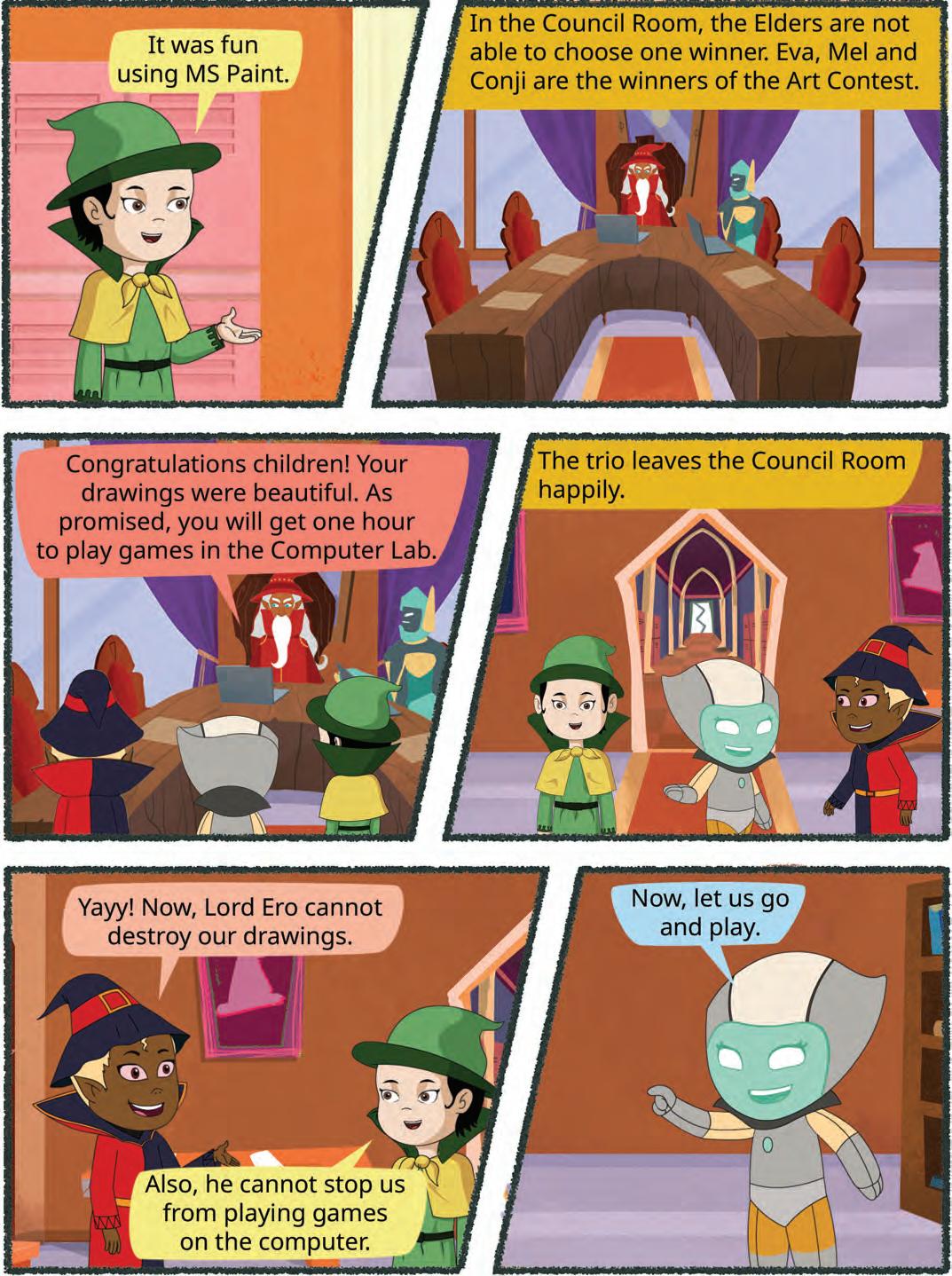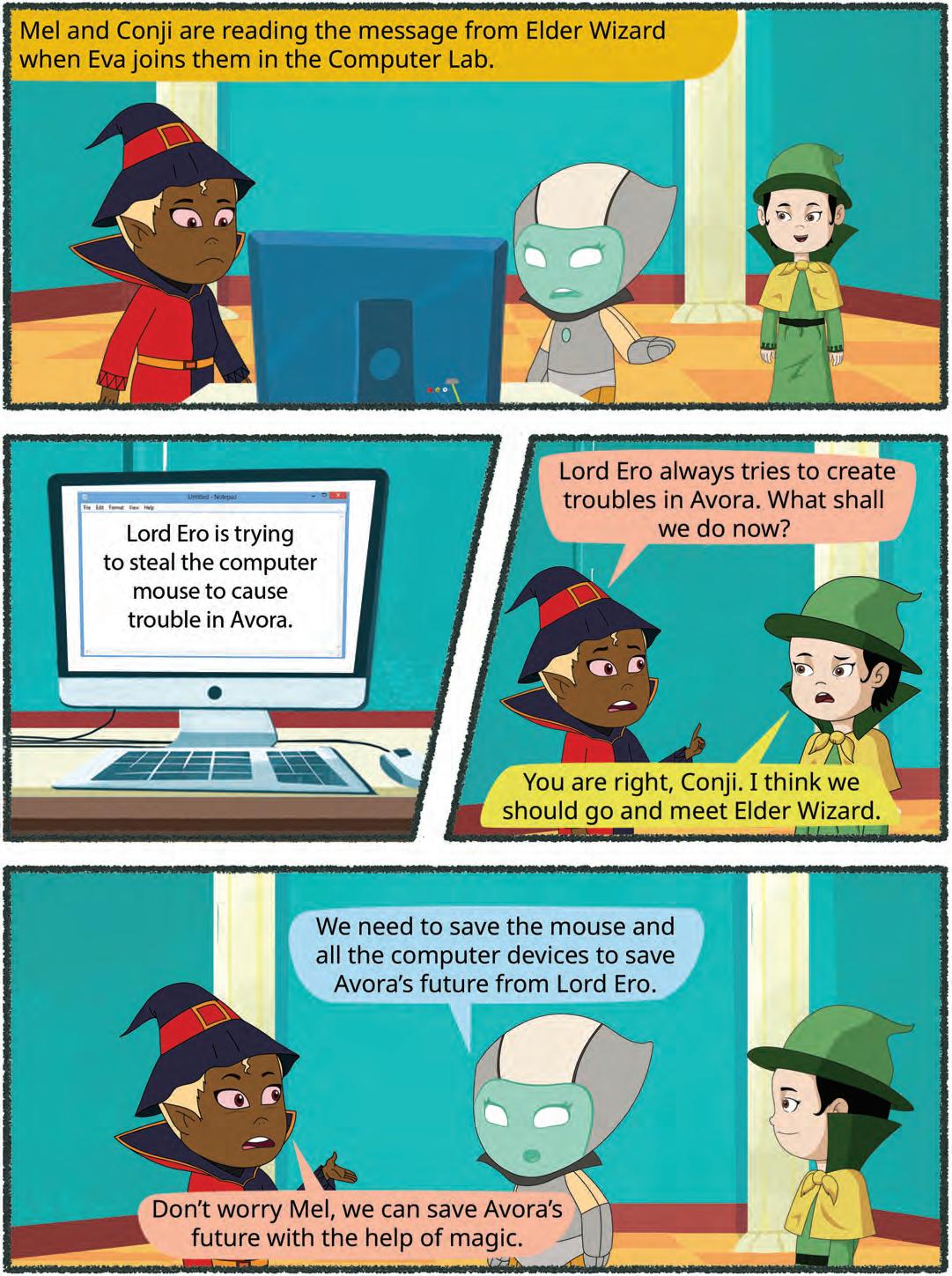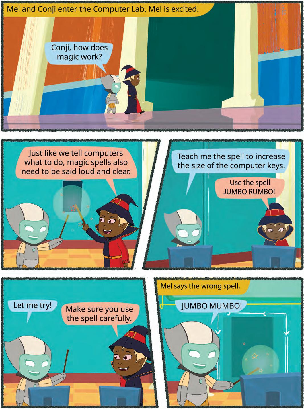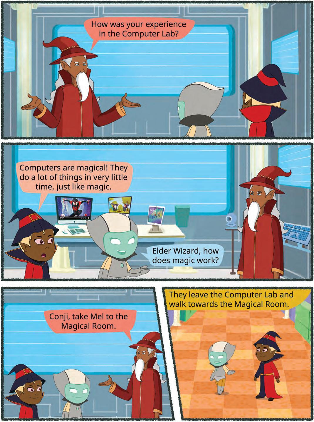 In every grade, students embark on an immersive experience in the “Adventures of Mel and Conji”. Within each chapter, in the initial section (Section A), the story unfolds, enveloping learners in an exciting journey. Through the story, students actively connect with fundamental concepts in the realm of Computer Science.