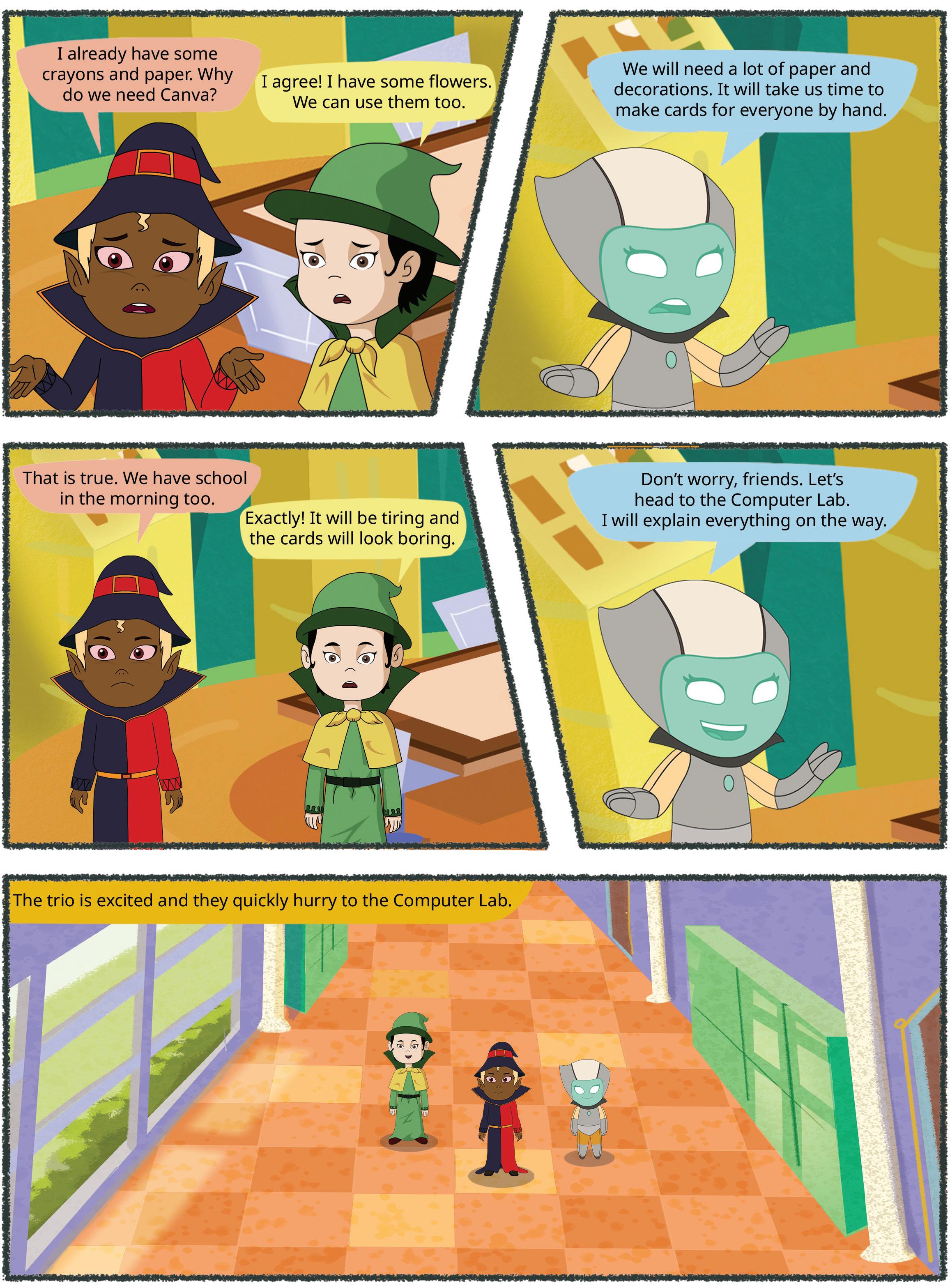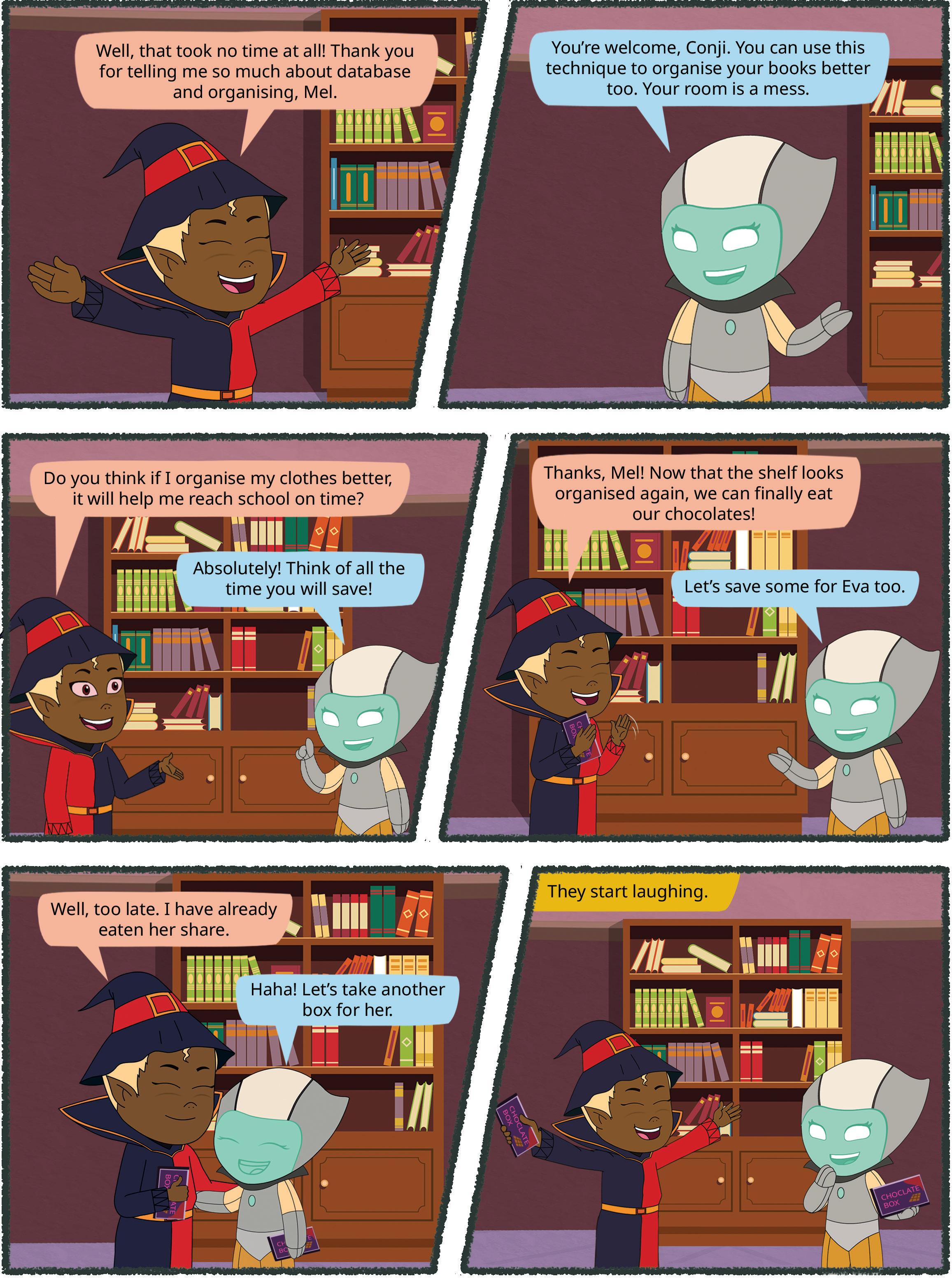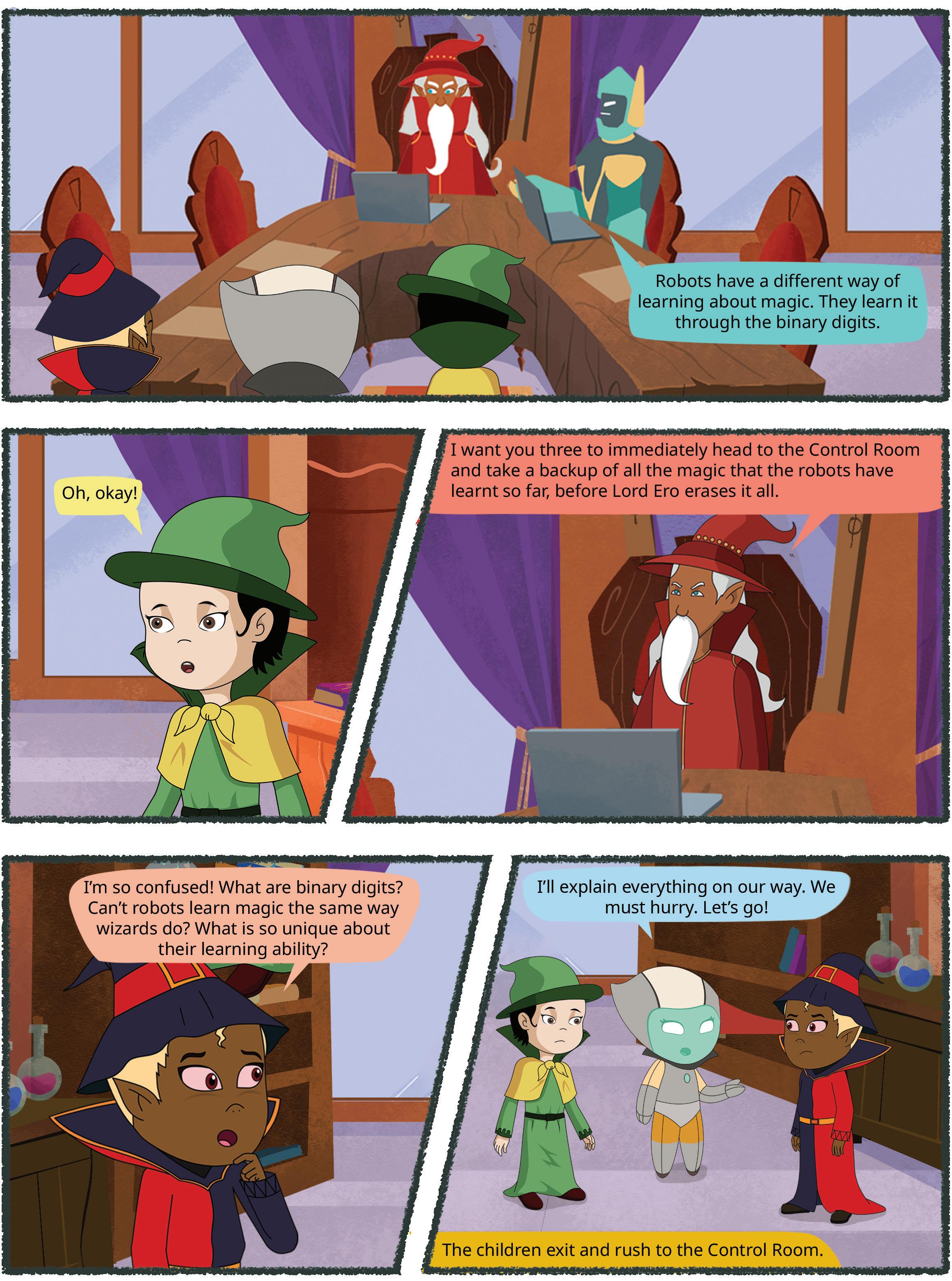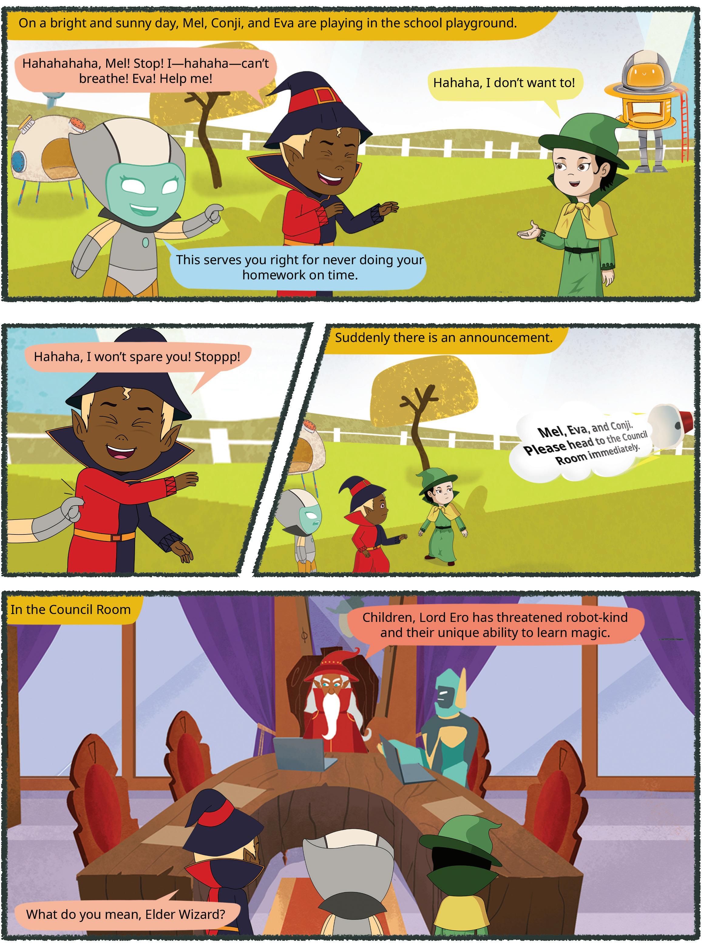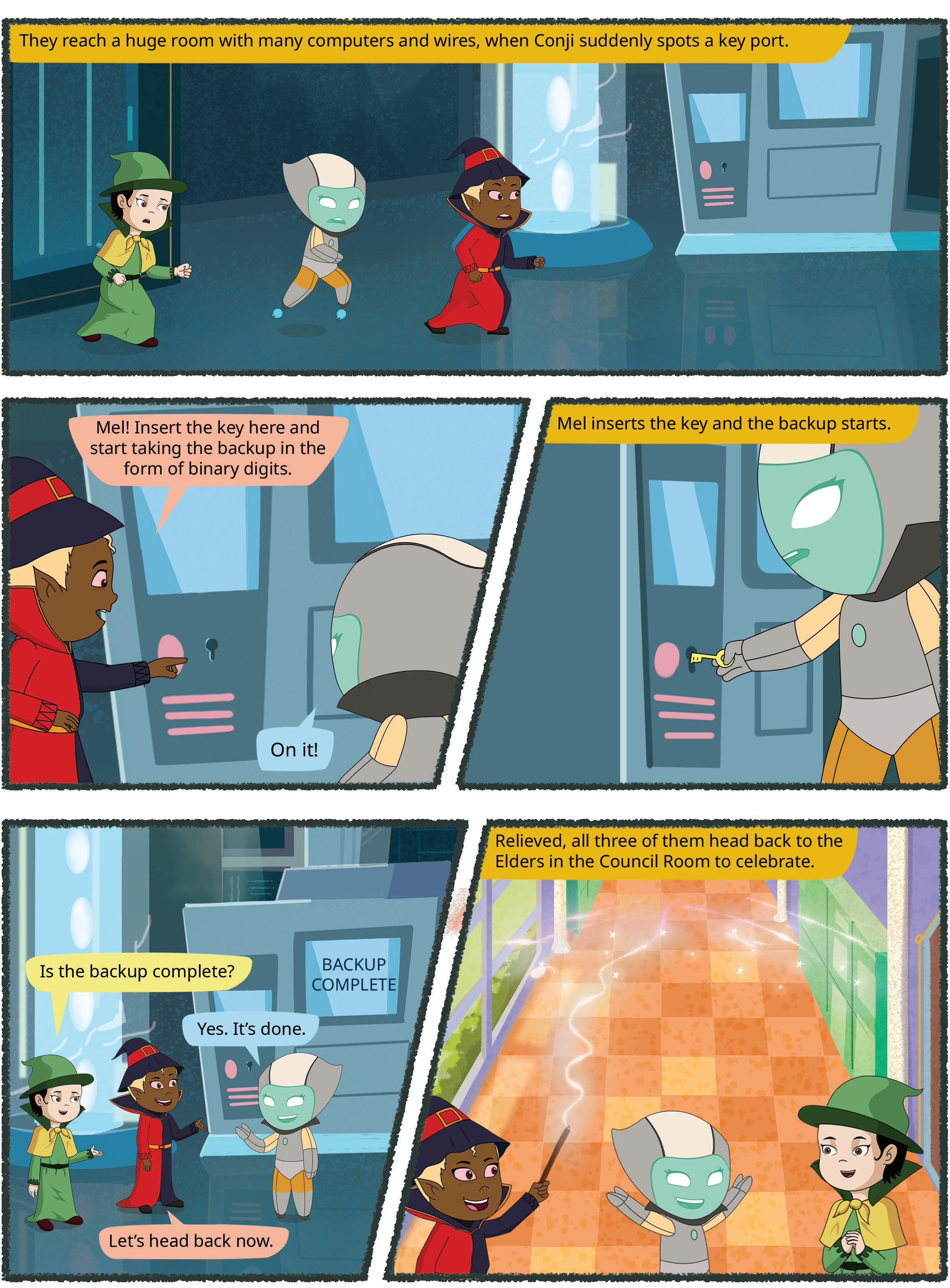 In every grade, students embark on an immersive experience in the “Adventures of Mel and Conji”. Within each chapter, in the initial section (Section A), the story unfolds, enveloping learners in an exciting journey. Through the story, students actively connect with fundamental concepts in the realm of Computer Science.