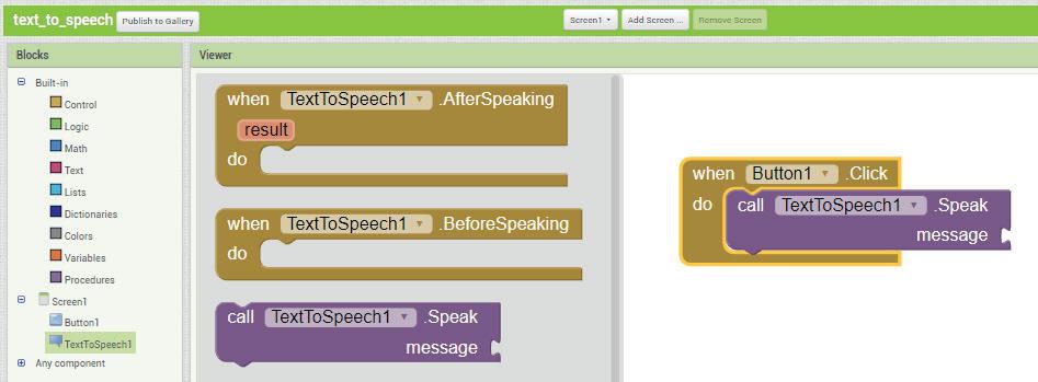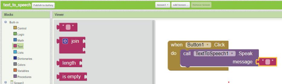 From the Blocks drawer, drag the call Text to Speech1.Speak block and drop it inside the when Button1.Click block.