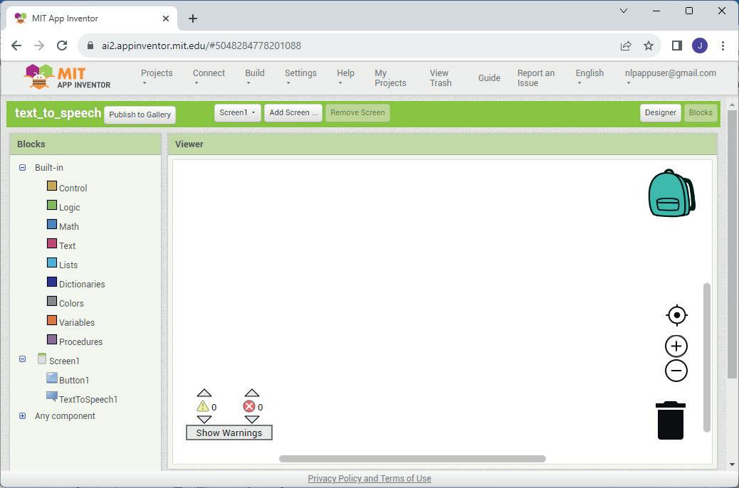 The Blocks Editor will open with the Blocks section on the left and the Viewer section on the right.