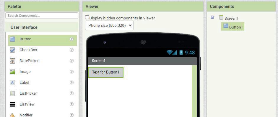 From the Palette section, drag the Button component and place it in the Viewer section on Screen1.
