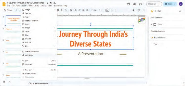 4 Happy wants to add visual effects to elements on his slides to make them more engaging. Which feature in Google Slides should he use?