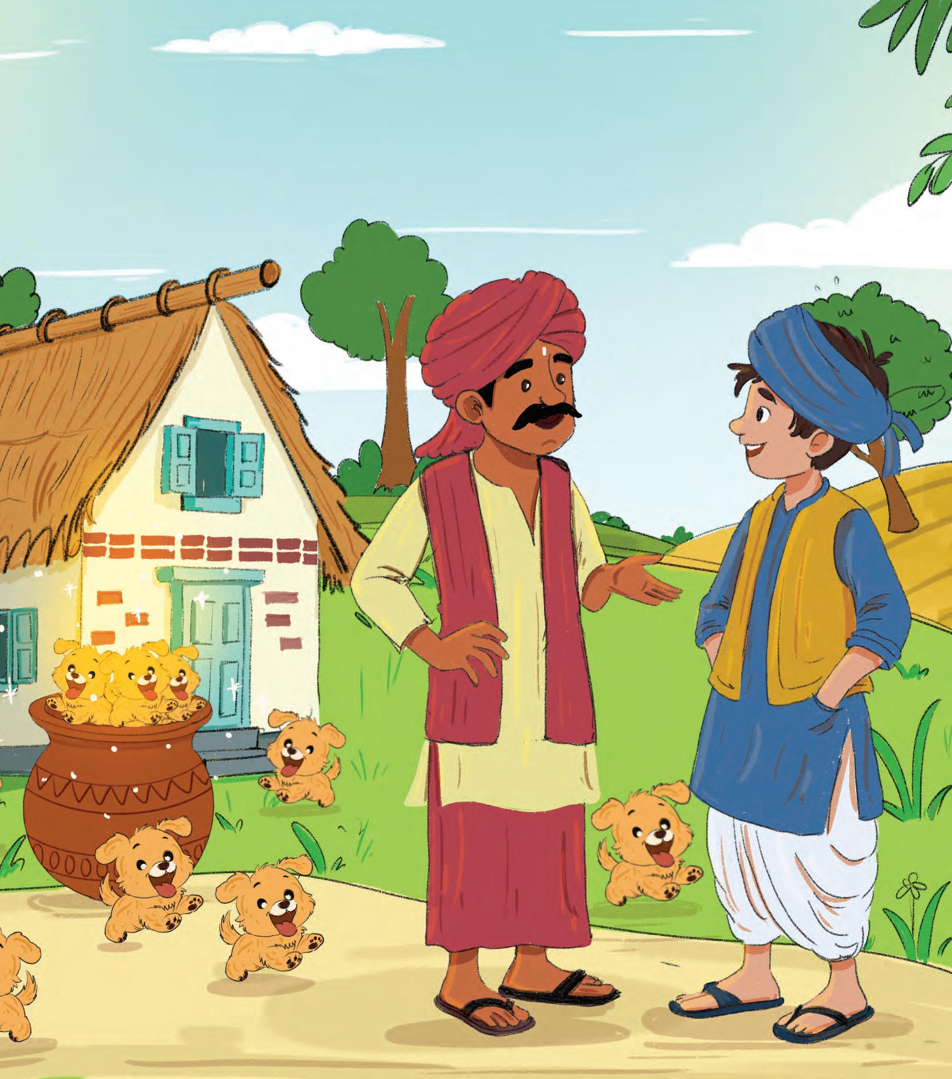 The neighbour ran away in fright! A hundred dogs ran after him, barking loudly. The neighbour never came to Gopi’s house again. Gopi kept on helping the villagers.