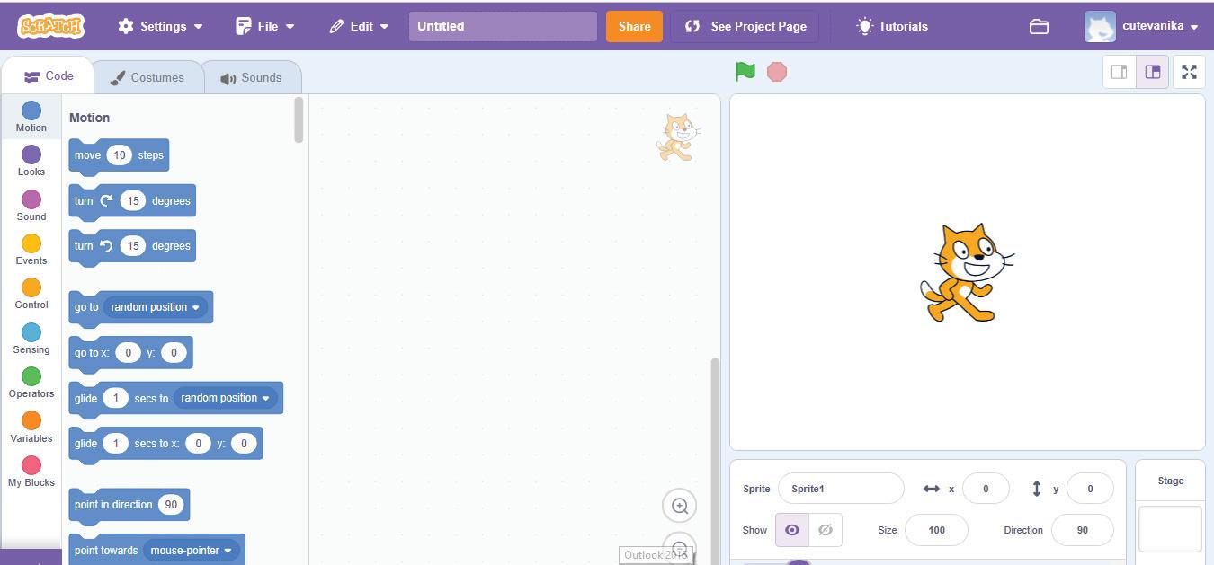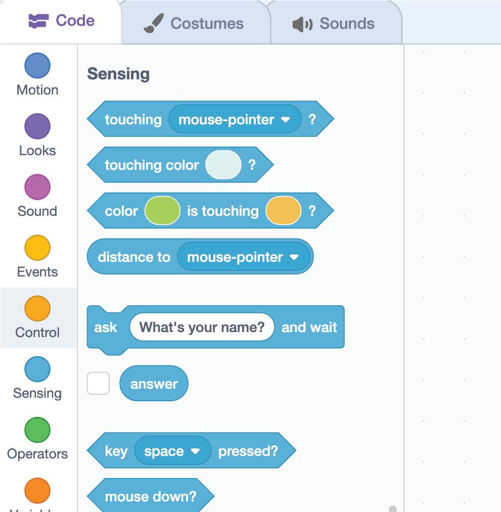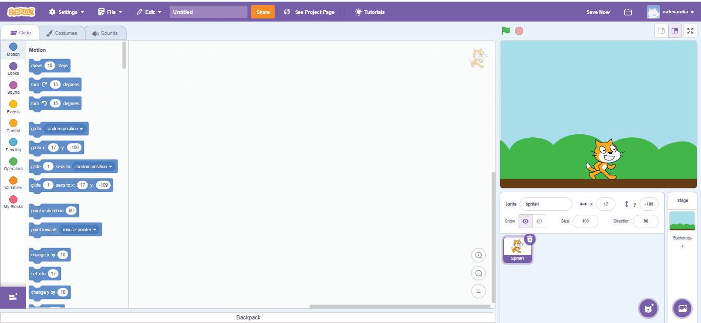 a. Code: This tab has different code blocks and the Code area, where we can drag and join the blocks to make the sprite move and do things.