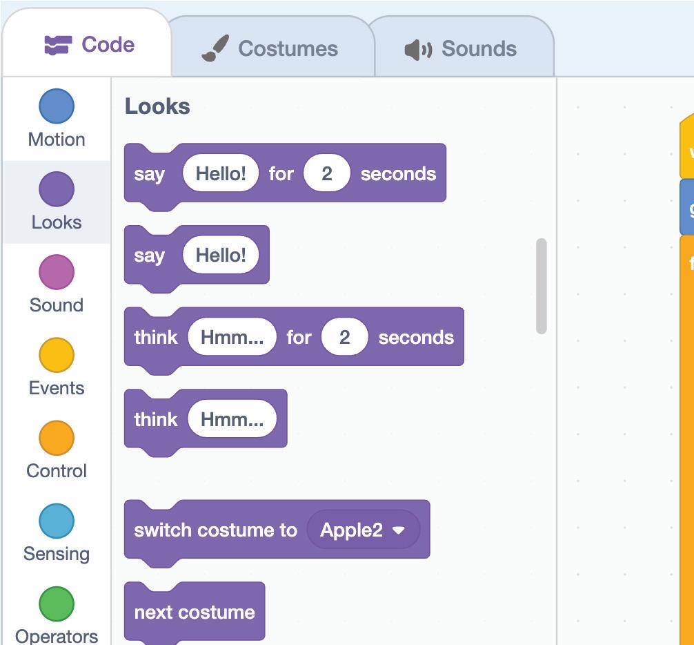 The Looks blocks are the blocks that control how a sprite looks. There are 23 Looks blocks. Some of them are: