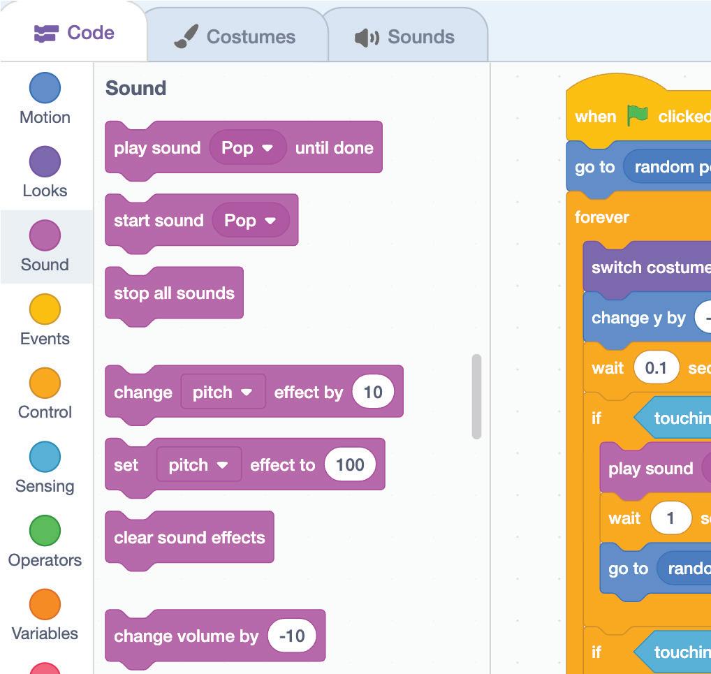 2 You can add and make changes to the sound effects of the sprite and backdrop in the Sound Editor.