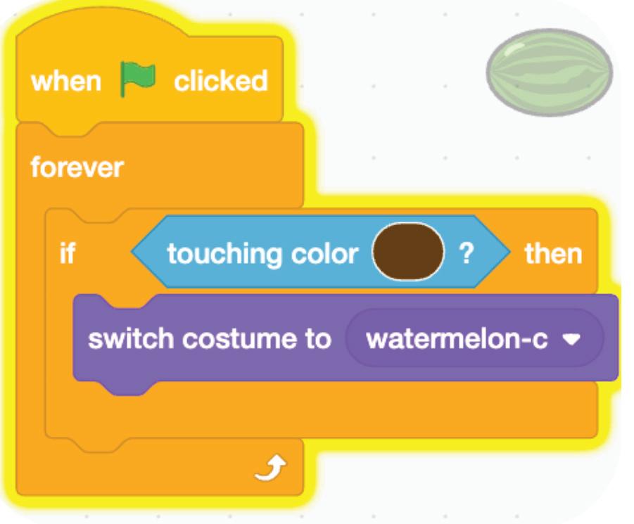 13 Change the sound to Crunch in the play sound block in the if touching color? block.