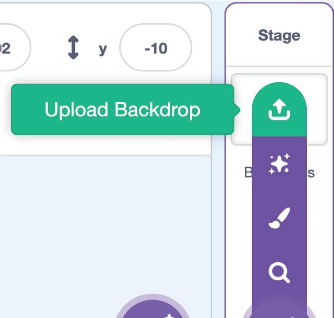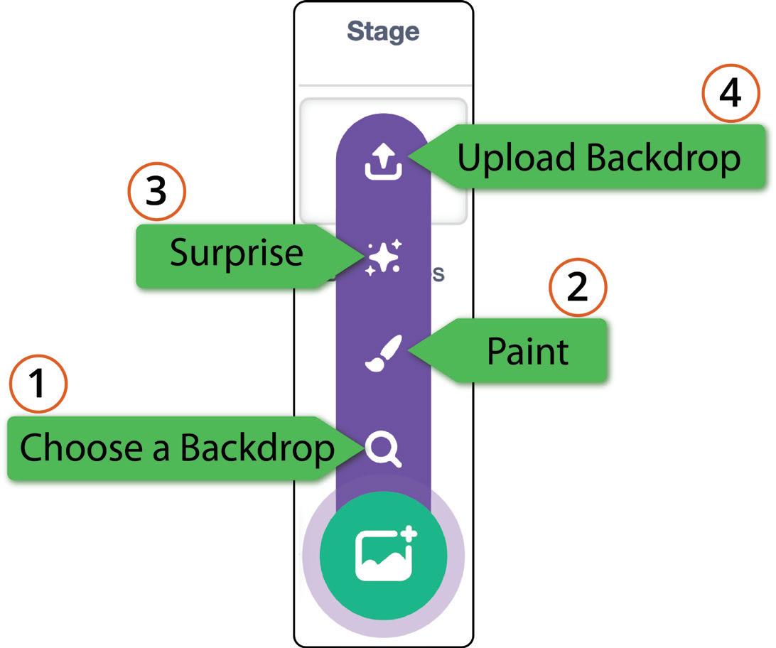10 Backdrop Pane: It is below the stage and next to the Sprites Pane. You can use it to add, upload, edit, or delete backdrops.