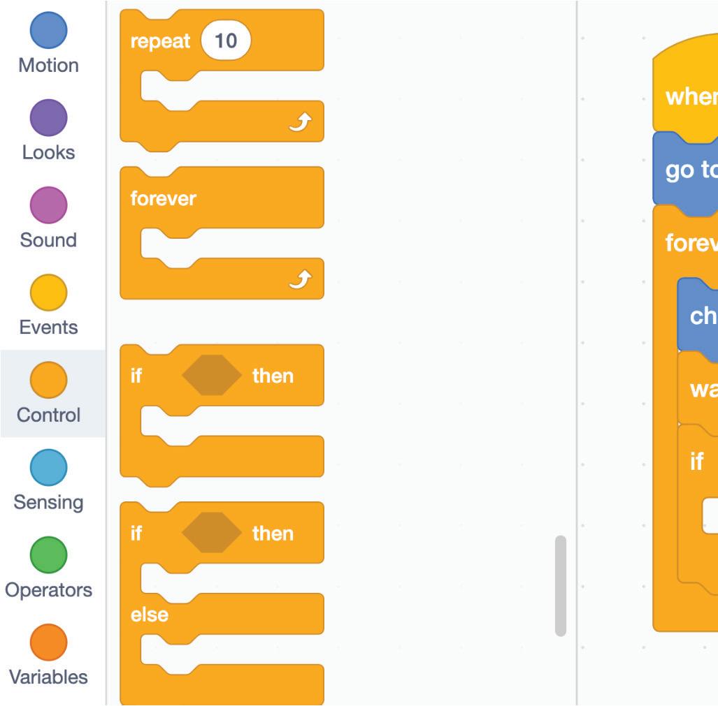 4 Join the duplicated block inside the if touching color? block between the switch costume and wait blocks.