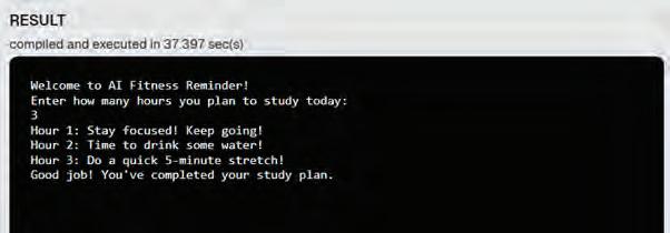 Just like real AI assistants use data (such as heart rate, sleep patterns, or activity levels) to give health tips, this Java program uses user input and logical conditions to provide contextual reminders. It teaches how AI can be simulated using fundamental programming concepts like input, loops, and decision-making.