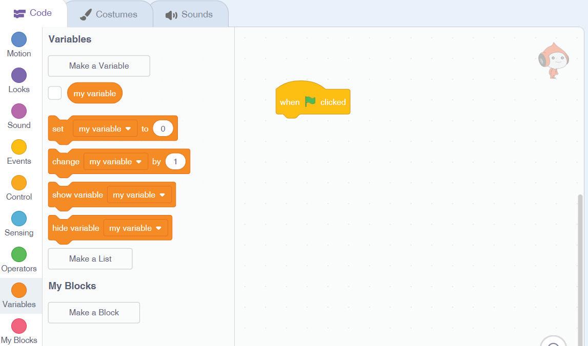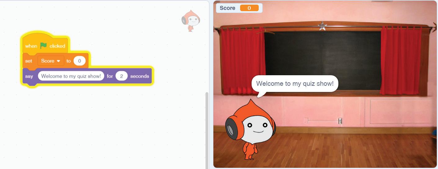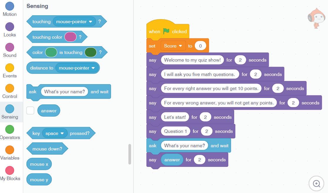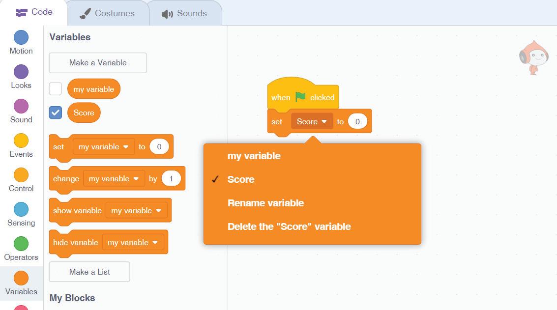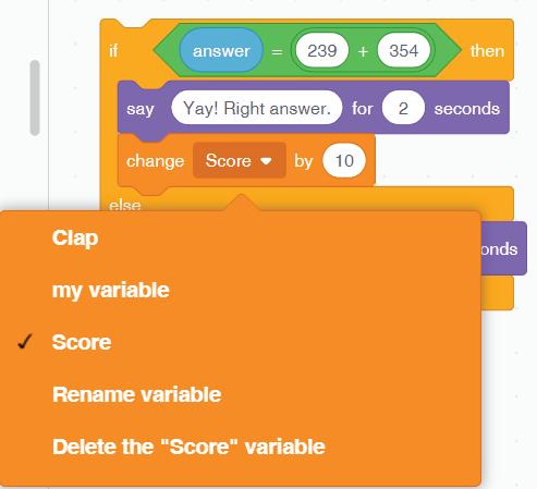 7 Now, add the block from the Variables category to change the score by 1 whenever the player clicks the sprite.