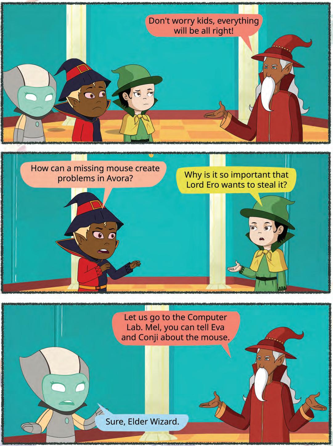 In every grade, students embark on an immersive experience in the “Adventures of Mel and Conji”. Within each chapter, in the initial section (Section A), the story unfolds, enveloping learners in an exciting journey. Through the story, students actively connect with fundamental concepts in the realm of Computer Science.