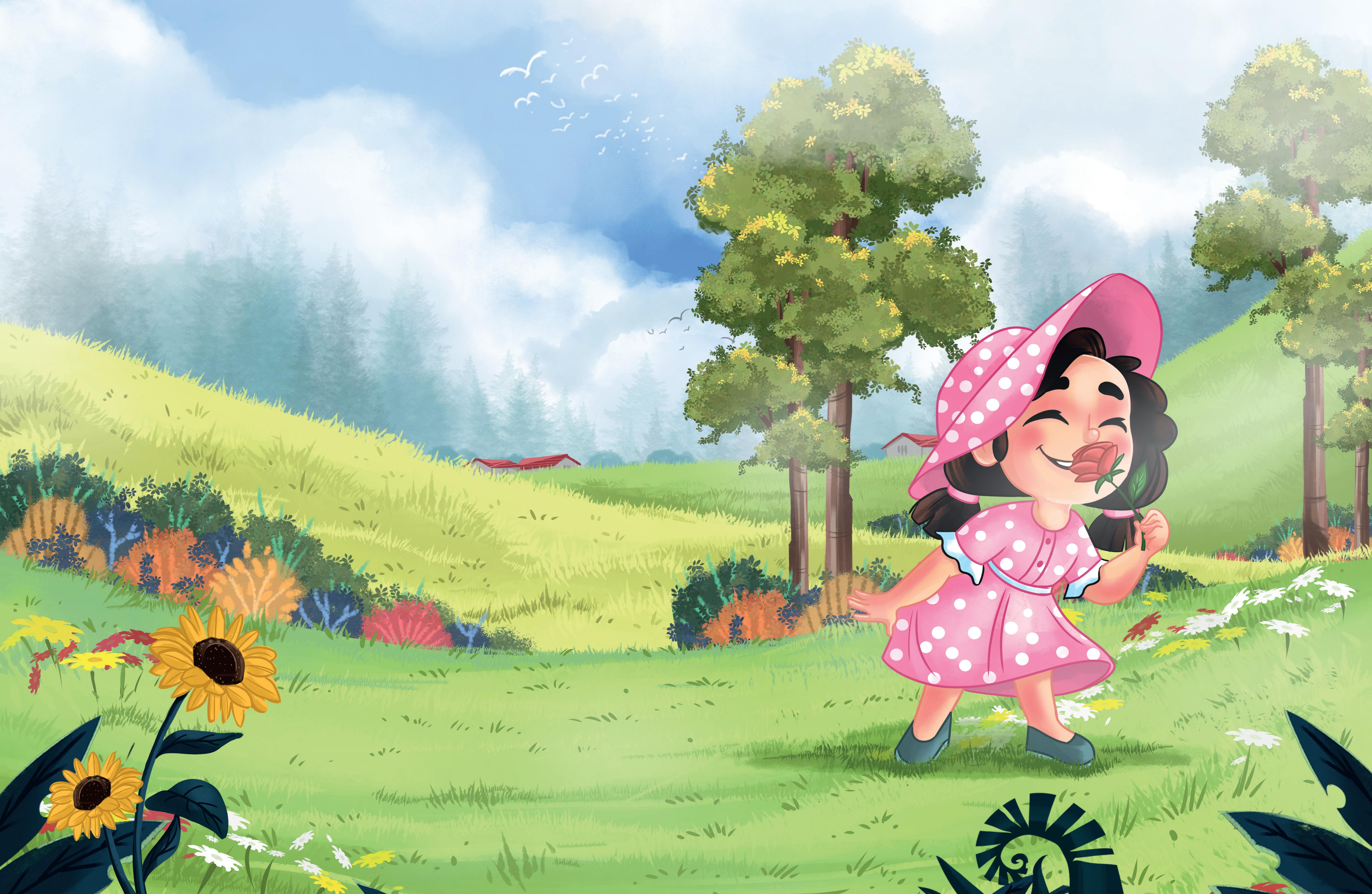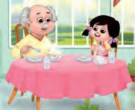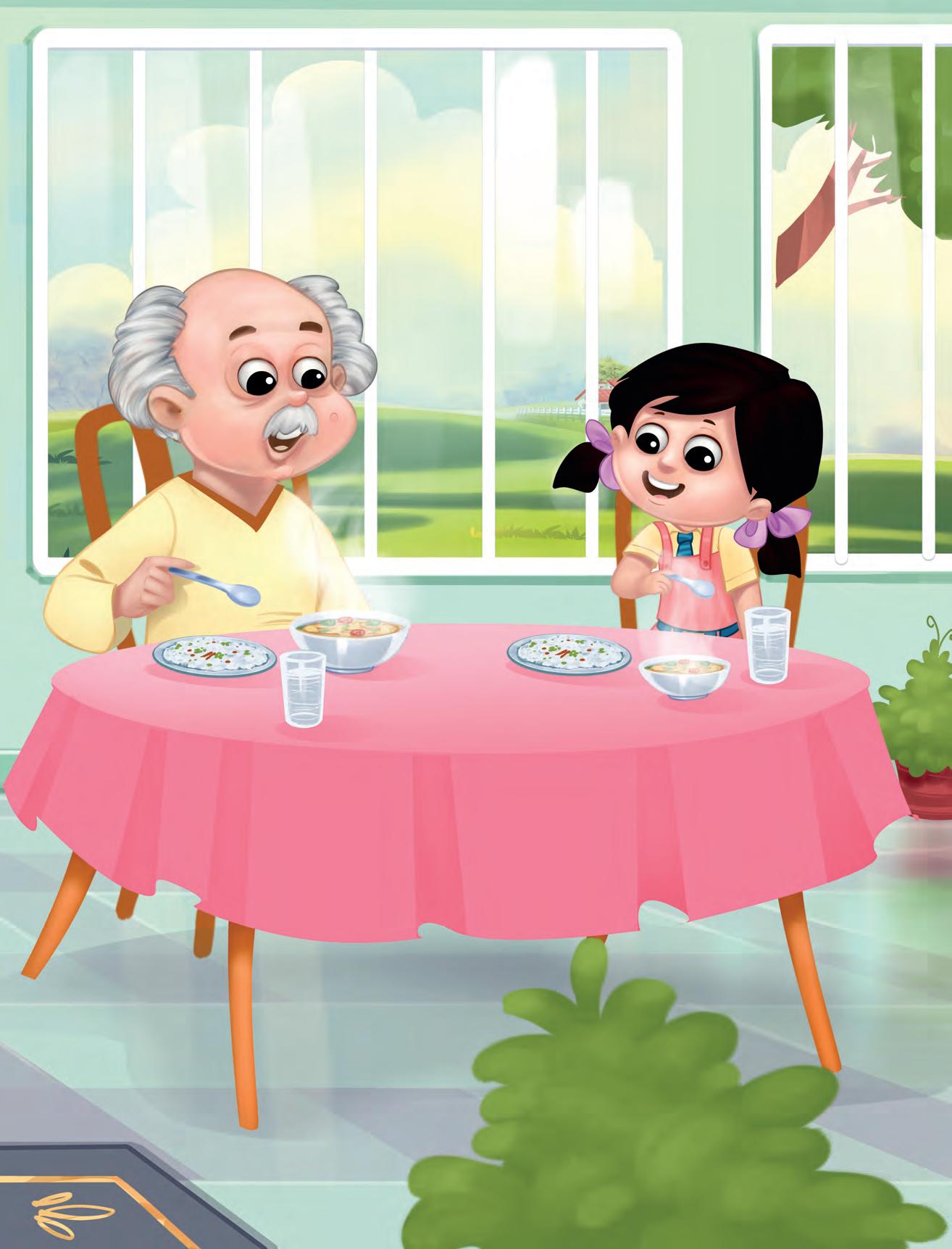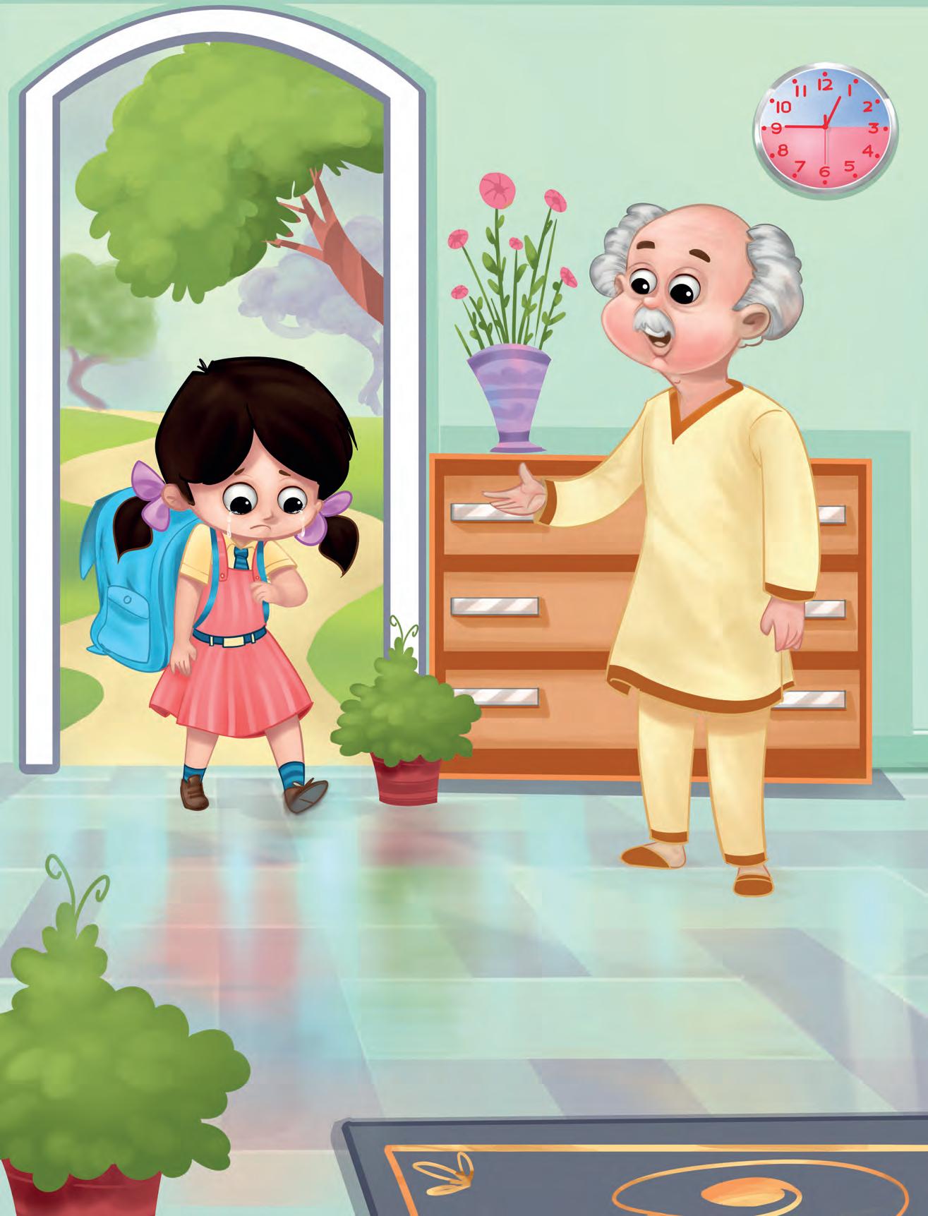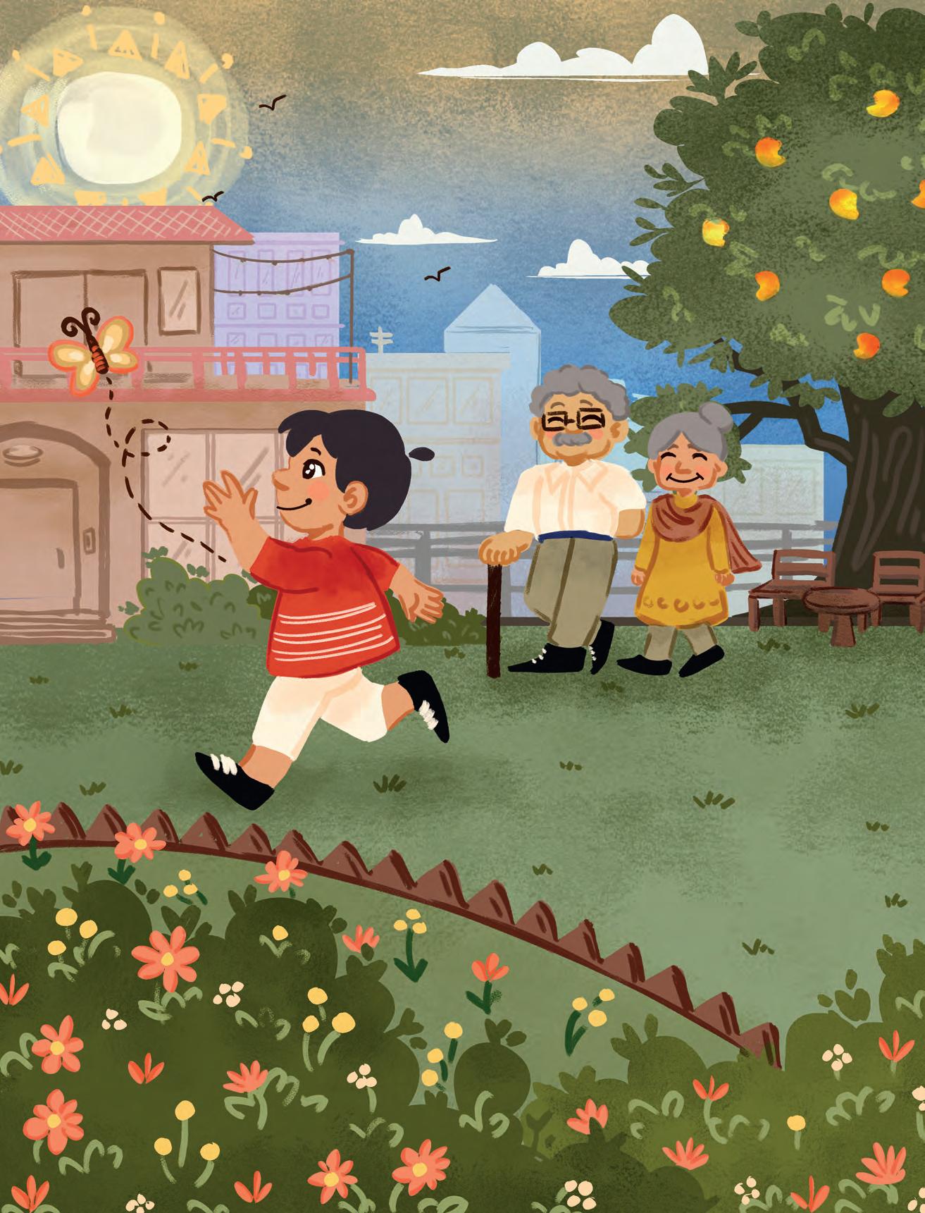 In the morning, I walk in the garden with my grandmother and grandfather. It is full of pretty flowers—roses, lilies and sunflowers. I never pluck flowers in the garden. Oh yes! There are colourful butterflies too! I run after them, but can never catch them. I love the mango tree in my garden. My grandfather always gives me a yummy mango from the tree. We eat it together.
