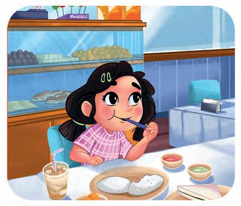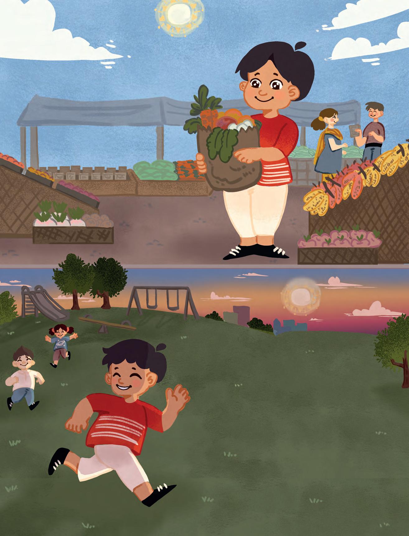 In the afternoon, I go to the market with my mother and father. We buy so many things from the shops there—milk, vegetables, fruits, eggs and soap! I also help them carry the things we buy. Then, we go to the bakery and eat my favourite chocolate pastry.