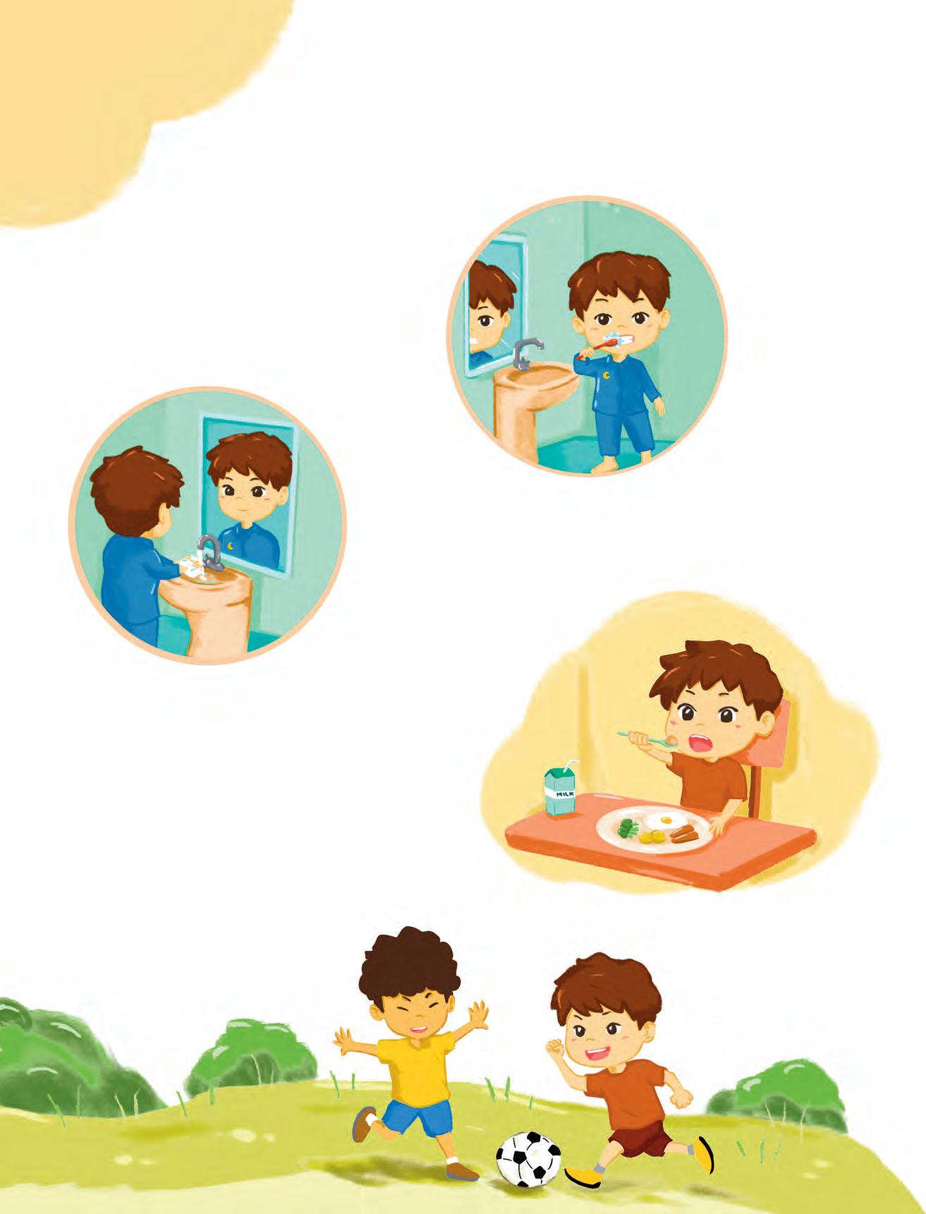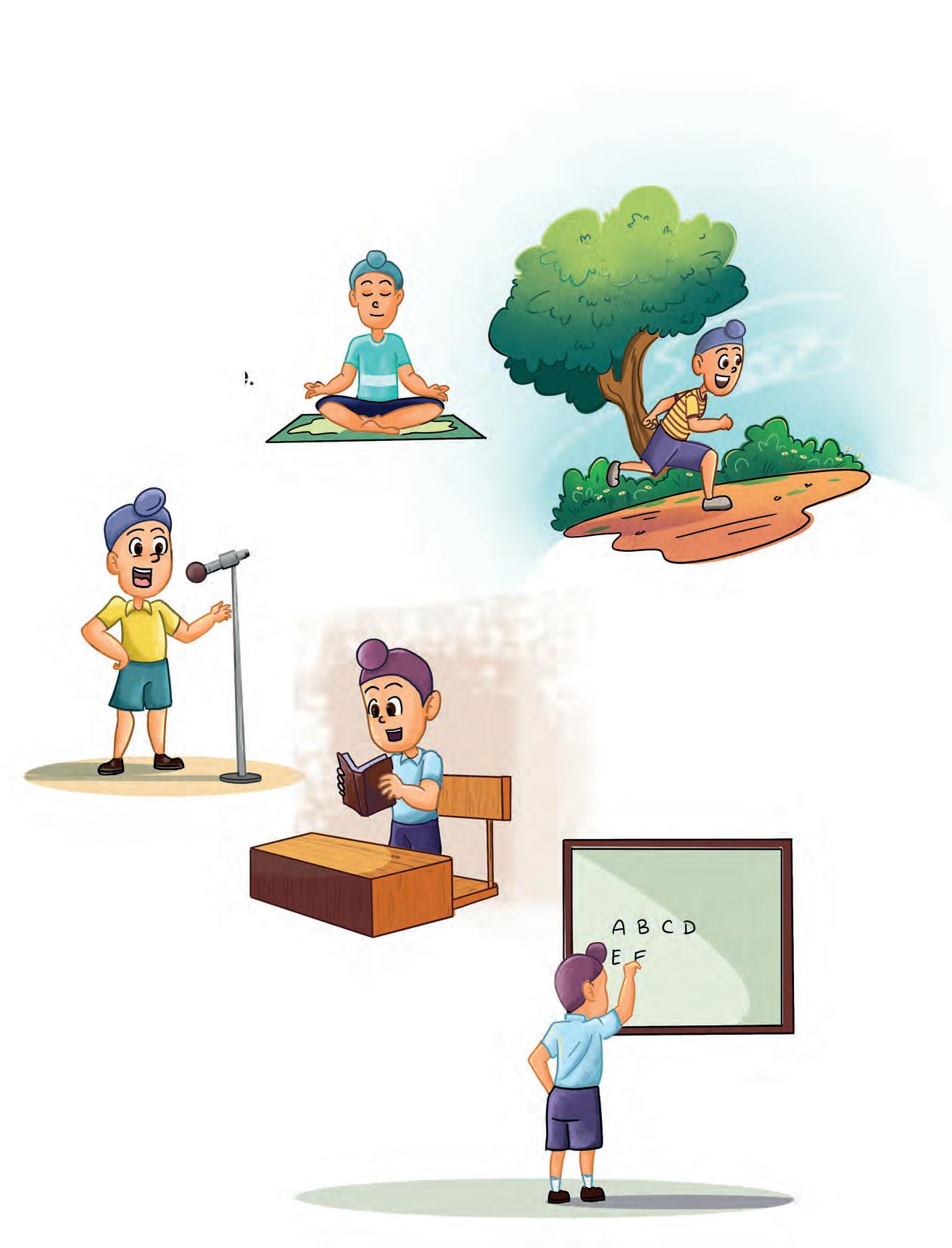 like the colour yellow It looks like the sun. also like to eat Butter, jam and bun. In the mirror see My friend and me. am fat he is thin We both are three. like to play catch And I like to play ball. like my toy train And I also like my doll. I like to draw and colour In my drawing book. I like the clothes wear, I like the way look. My hair is black, His is brown. I am from the city He is from the town love myself And so does he. The good in each other We always see. rhyme time rhyme time 5 4 I Like Me and My Friend Speak expreSS name My name is Neel. school go to school every day. I live live in Delhi. live with my family. I am am a girl. am a boy. years old am four years old. I study study in LKG class. I like like my friends. I like mango shake. colour Yellow is my favourite colour. like all the colours. eat eat healthy food. play play with my toys. friend Neena is my best friend. fat My teddy bear is fat. thin My cat is thin. city live in a city. town live in a town. love love my school. love my parents. 7 6