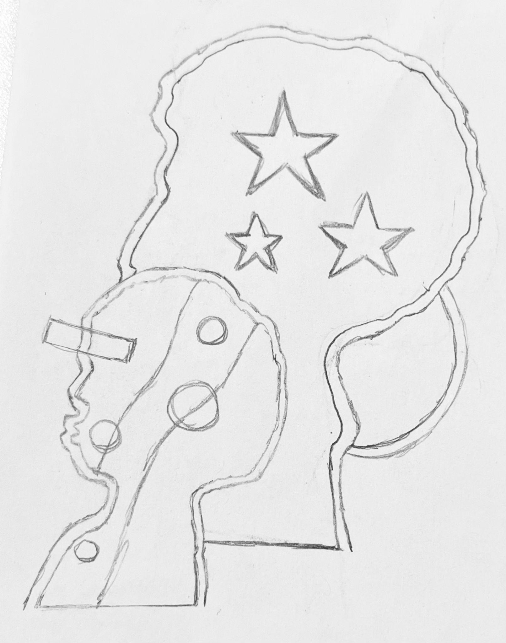 Drawing inspiration fromAfrofuturism, I have reimagined shapes and the profile of a head to create a visual representation that invites deeper contemplation.The stars symbolize the myriad thoughts that shape our consciousness, while the circles evoke a range of emotions that resonate with our experiences.The outer traced line of the head serves as a powerful symbol of protection, connecting us to the divine.This design not only captures aesthetic beauty but also embodies profound meanings that enhance the architectural narrative.