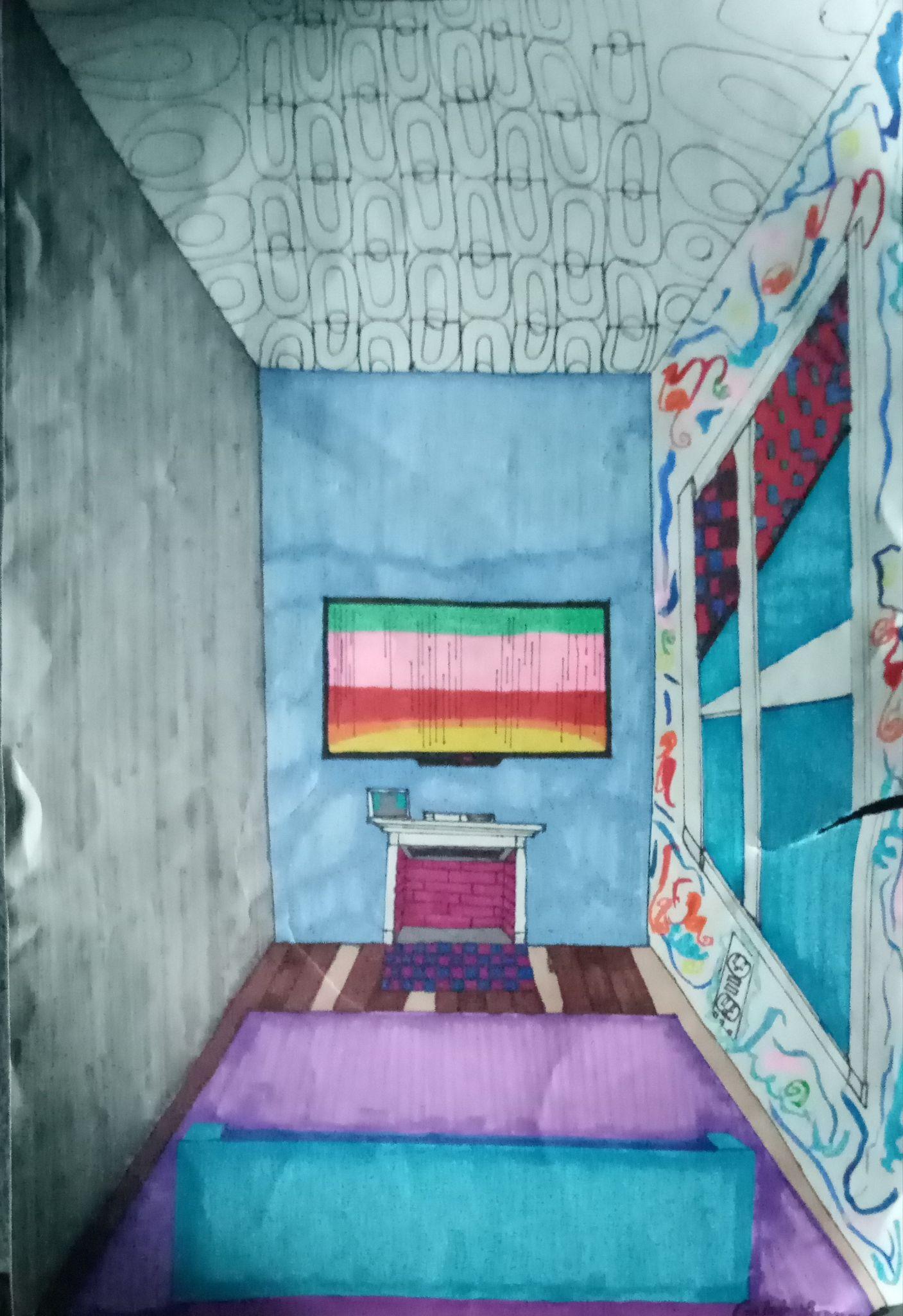 This portrait resembles a conventional living room with historical features. I made it when I moved into our current house, which was supposed to be a placeholder for our desired living room layout. Although the room was small, it was intended to be a scaled-down version of the desired layout. I added a ceiling with different textures that evoke historical feelings, representing the floor of the fireplace, television, and window.The window’s various elements of color are meant to represent a wallpaper that plays a crucial role in the aesthetic.