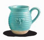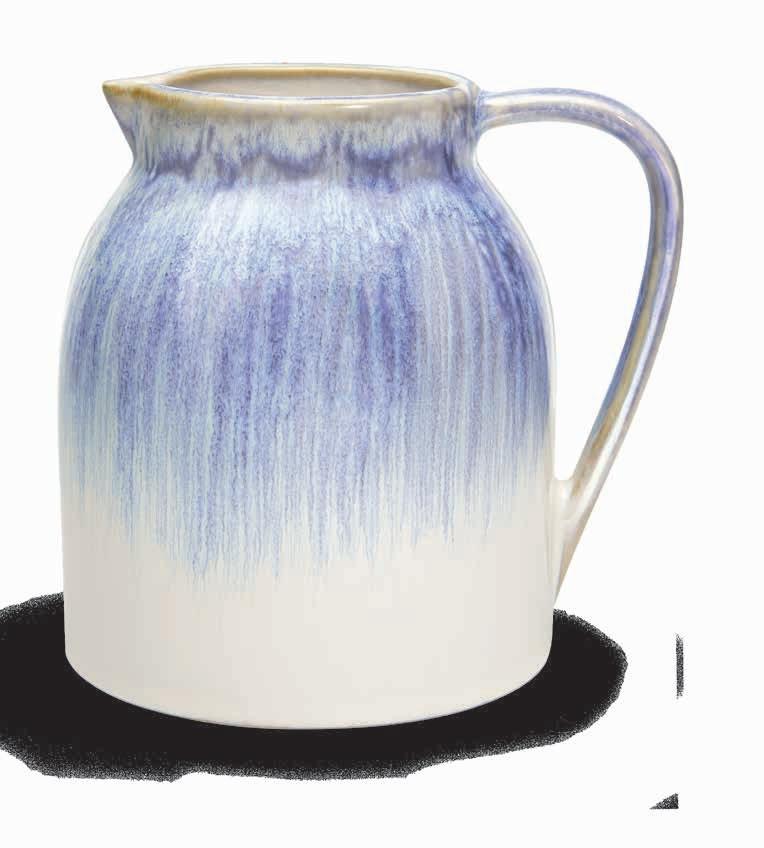 Reactive-glazed stoneware pitcher with natural base; FDA-approved to safely serve and store drinks.