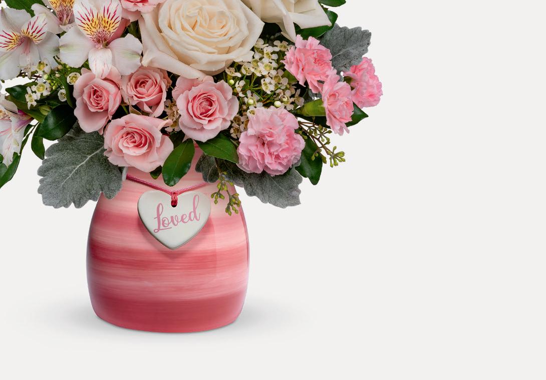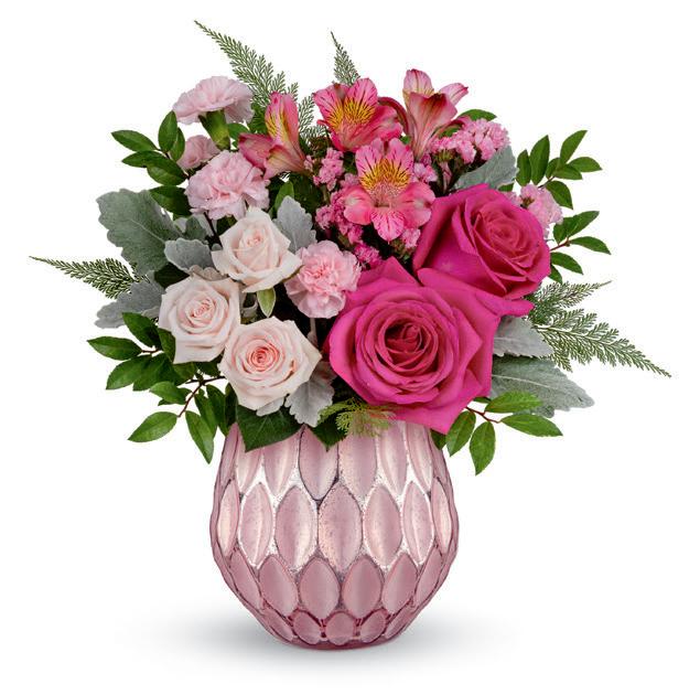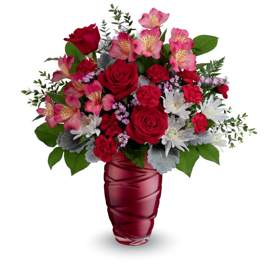 • This stunning Teleflora Exclusive vase with swirling details will wow consumers all year round. Great for Valentine’s Day, Christmas, Birthdays, and Just Because.