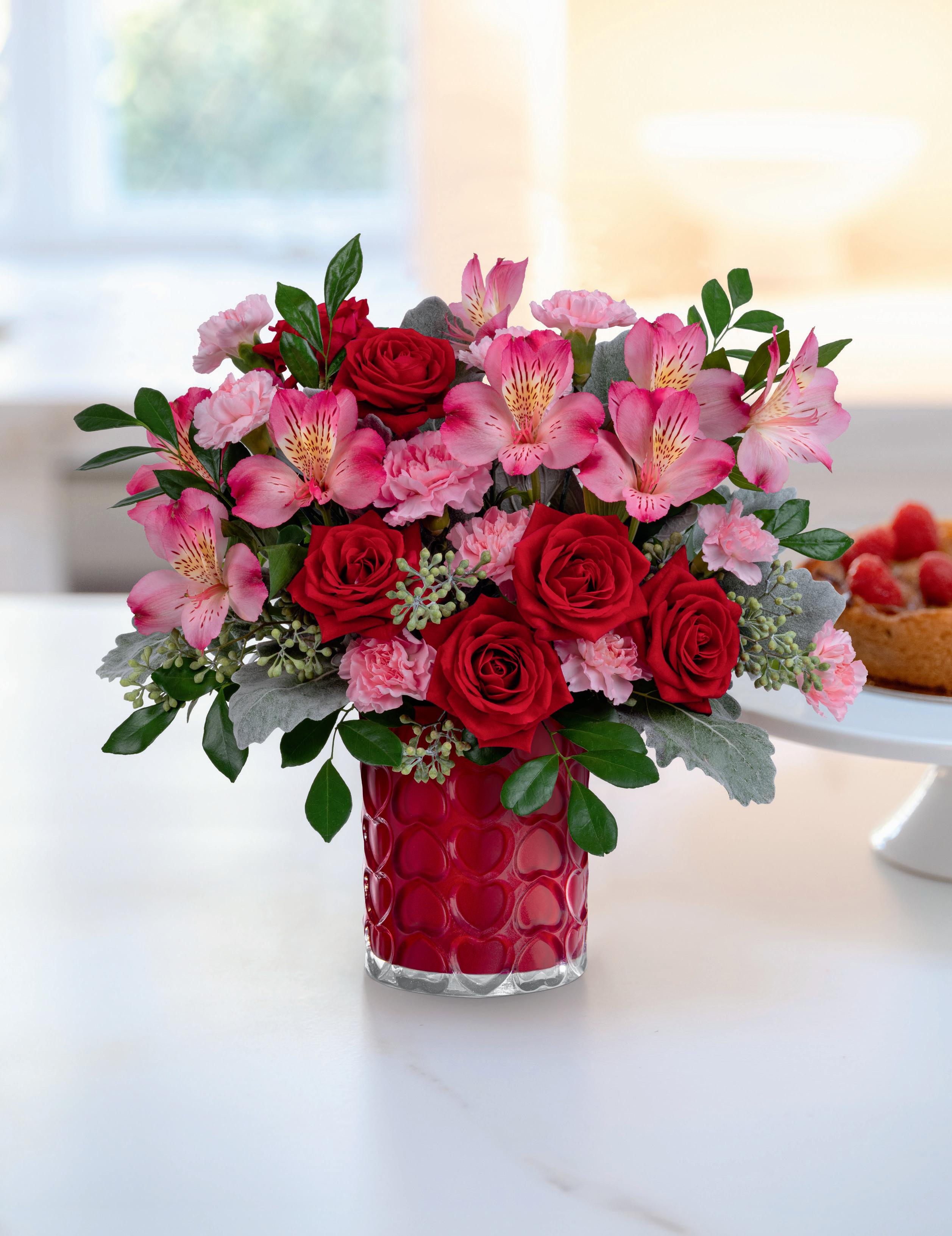 • This stunning Teleflora Exclusive vase with swirling details will wow consumers all year round. Great for Valentine’s Day, Christmas, Birthdays, and Just Because.