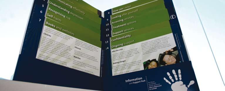 We launched a new information pack designed to help anyone who is concerned about a friend or family member who is distressed or suicidal . The pack was developed after research showed that many people found it hard to access good quality information on how to recognise suicidal behaviour and what to do to support someone in distress. (see page 25)