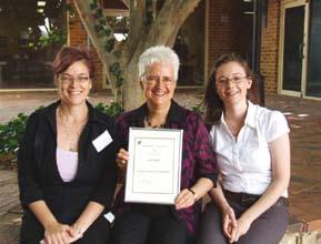 Consumer involvement recognised Institute researchers Jan Payne and Heather D’Antoine, from the Alcohol and Pregnancy Project, received a Health Consumers’ Council Excellence Award for their outstanding contribution to consumer and community participation. The consumer and community participation aspects of their alcohol and pregnancy project were an example of ‘good practice’ for community engagement and included community reference groups that consisted of consumer and community representatives from both Indigenous and nonIndigenous backgrounds. Jan Payne is pictured below (centre) with Consumer Representatives Pip Brennan and Jess Braithwaite.