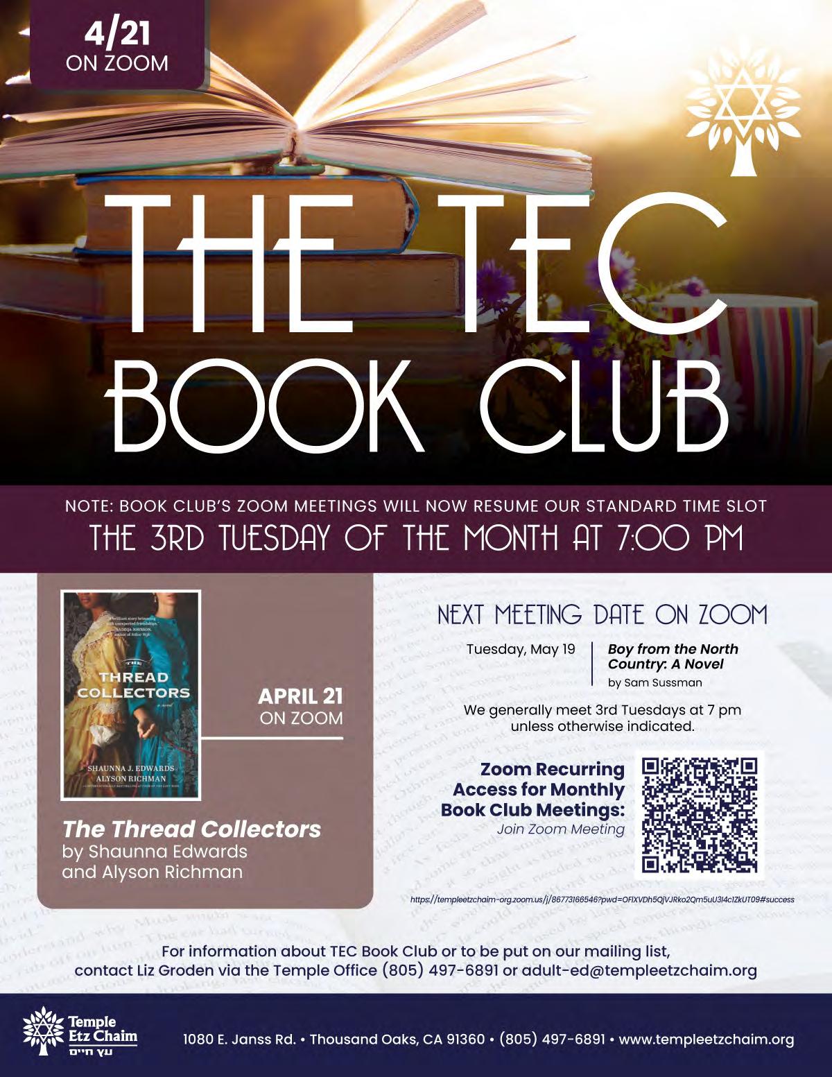 Upcoming events include Men’s Club/WoTEC shabbat April 3-4. Sign up now to participate! We will soon announce havdallah hikes and a new TEC Cycling Club – get ready to roll!