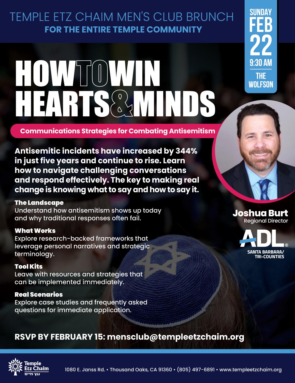 Join us for the second Sunday brunch of 2026 on February 22, 2026 at 9:30 am when the regional director of ADL Santa Barbara / Tricounties, Joshua Burt, addresses antisemitism in our community and provides techniques for talking about antisemitism and growing allies.