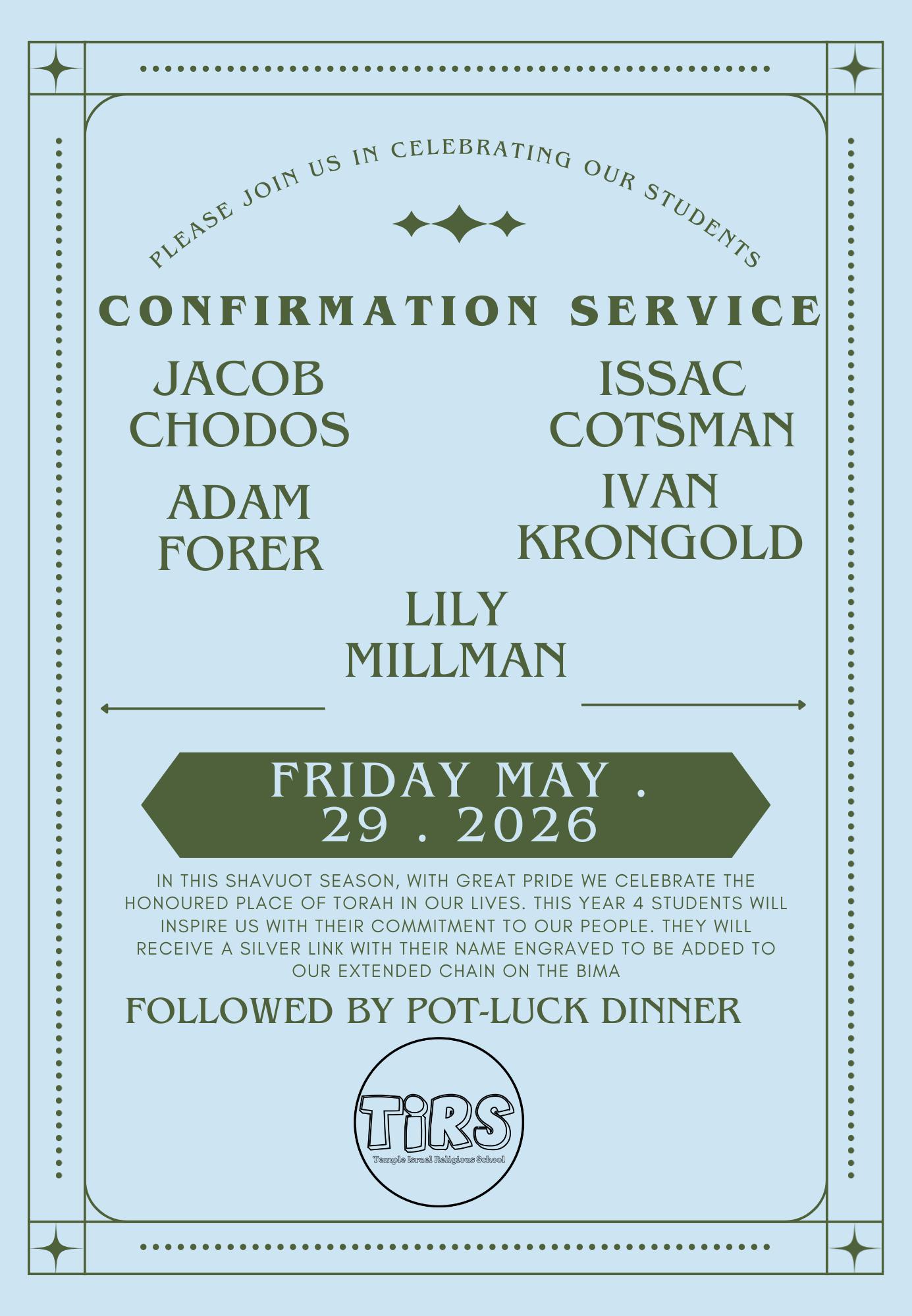 Registration is required and will be shared shortly in our weekly bulletins. Dinner will be provided by Creative Kosher Catering