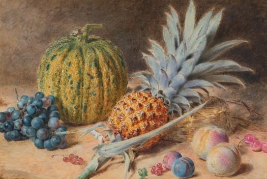 A still life of a gourd, pineapple, red grapes and other stone fruit Watercolour, 35cm by 52.5cm