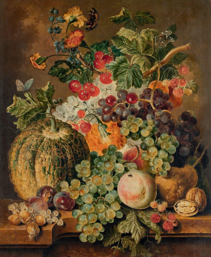 Still life of a gourd, various fruit, cob nuts and a walnut arranged on a stone ledge with butterflies
