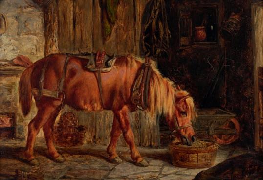 Attributed to James Hardy Jnr. (1832-1897) Chestnut pony feeding in a stable Oil on board, 17cm by 24.5cm