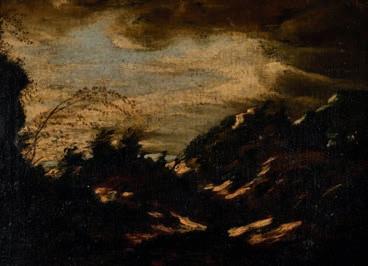 Follower of Pier Francesco Mola (1642-1666) Italian Landscape with solitary hilltop building Oil on canvas, 27cm by 38cm