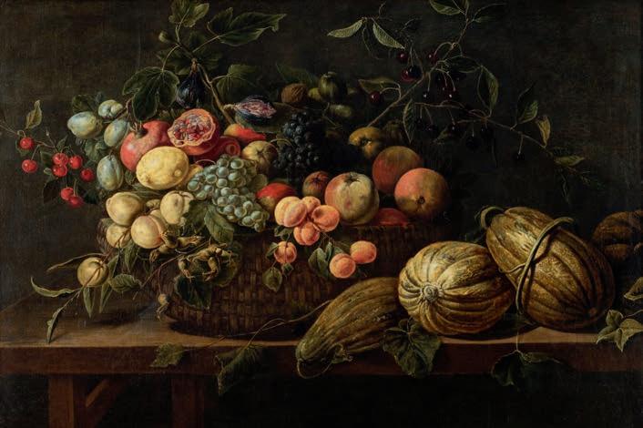 An abundant basket of fruit on a wooden ledge Oil on canvas, 76cm by 114cm