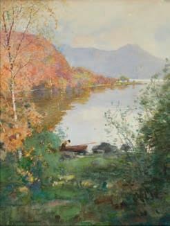 Lakeland landscape with figure readying a rowing boat, possibly Lake Windermere