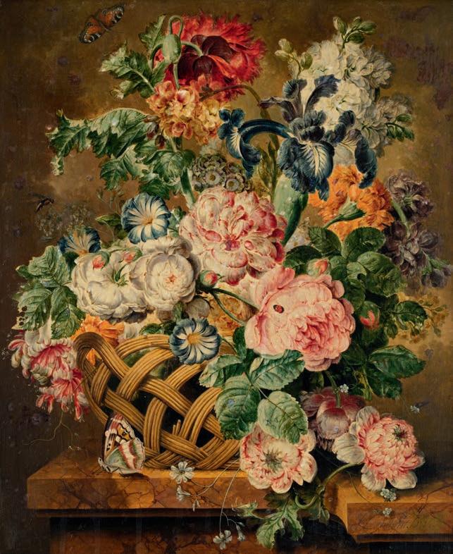 Still life of assorted flowers arranged in a basket on a stone ledge with butterflies and other insects