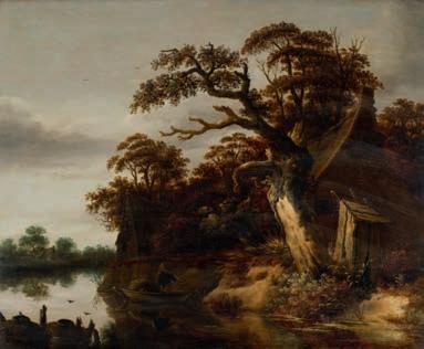 Attributed to Roelof van Vries (circa 1630 - 1681) Dutch Figure moving off in a laden ferry with buildings to the riverside Bears signature, oil on panel, 44.5cm by 55.5cm